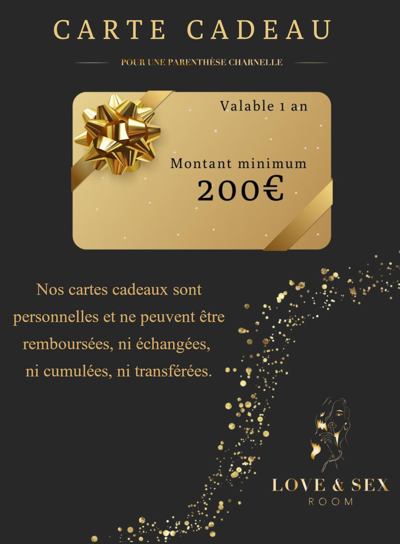 La carte cadeau est valable uniquement pour la Love & Sex Room de Ferney-Voltaire.